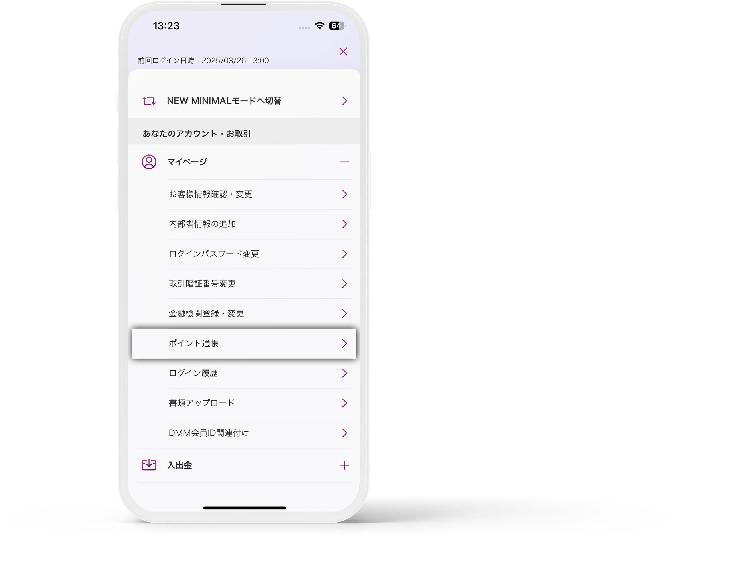 - NEW MINIMALモードの場合は画面左上の[≡]→[マイページ]→[ポイント通帳]をタップします。