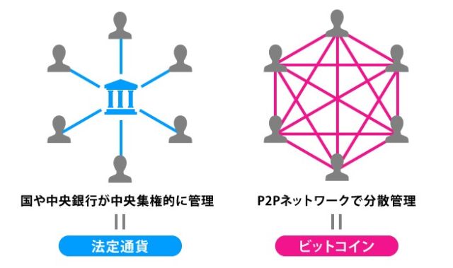 ビットコインは、日本円や米ドルなどの国や中央銀行などが発行する法定通貨とは異なり、発行元となる国や組織が存在せず、インターネット上のP2Pネットワークで分散管理されています。そのため、誰か特定の人が取引を止めたり、政府が独断で預金封鎖を行ったりすることがありません。これは電子マネーとビットコインの大きな違いでもあります。