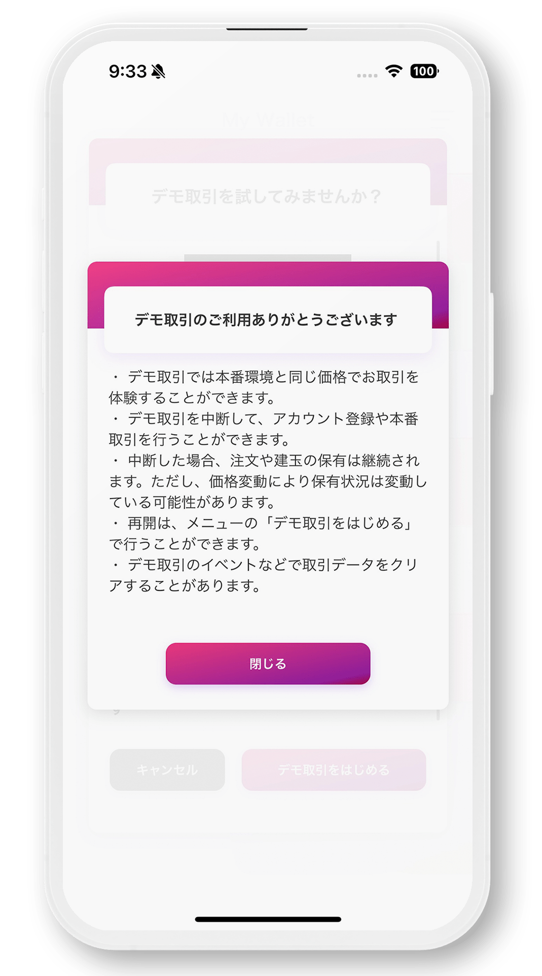- アプリを再インストールまたはアップデートすると、データが初期化され、デモ取引を開始した直後の状態に復元されます。