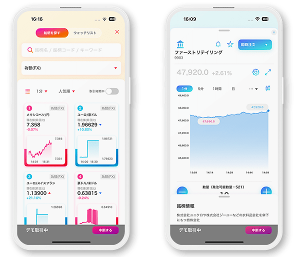 ウルトラ投資アプリTOSSYの使用感が知りたい方、操作を練習したい方はまずデモ取引から。実際に本取引で使用するアプリと同様の操作感なので、本取引でもスムーズな取引が可能です。