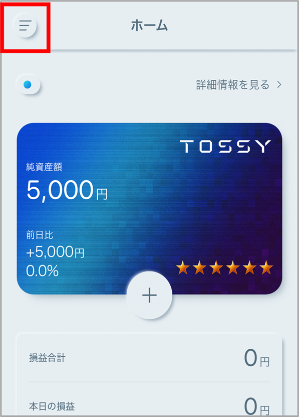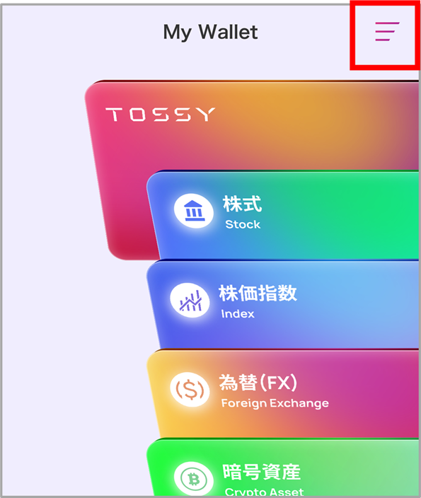 1.『ウルトラ投資アプリ TOSSY』を起動しログイン後、各画面左上部の[≡](メニュー)をタップします。