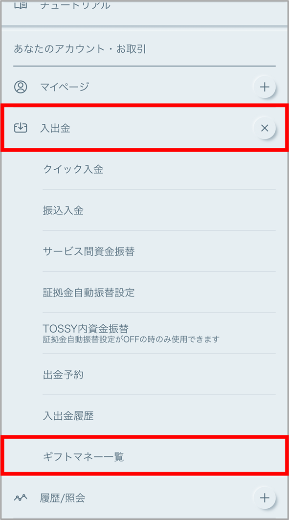 2.[入出金]>[ギフトマネー一覧]をタップしてください。