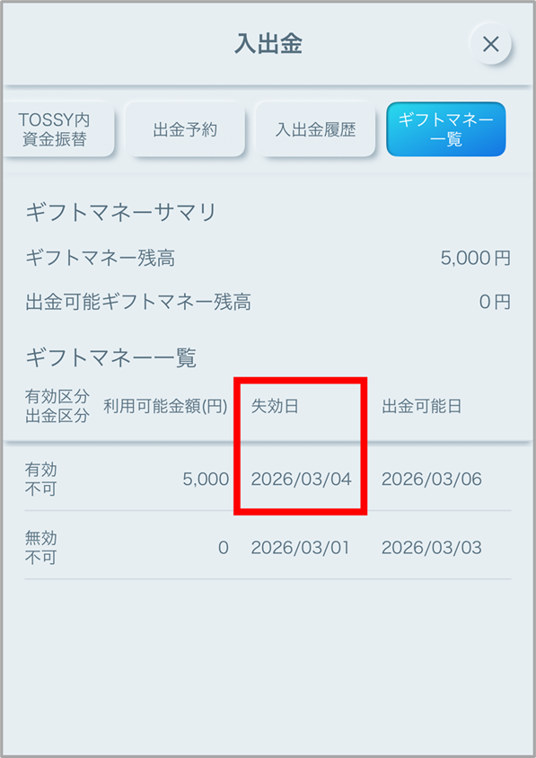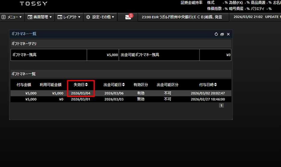 付与されたギフトマネーの失効日は、『ウルトラ投資アプリ TOSSY』ならびにTOSSY PC Webブラウザ版の、「ギフトマネー一覧」画面でご覧いただけます。