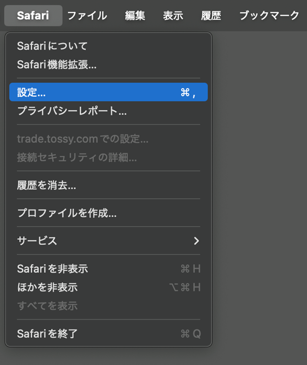 - メニューバーの [ Safari ] から[設定…]を選択します。