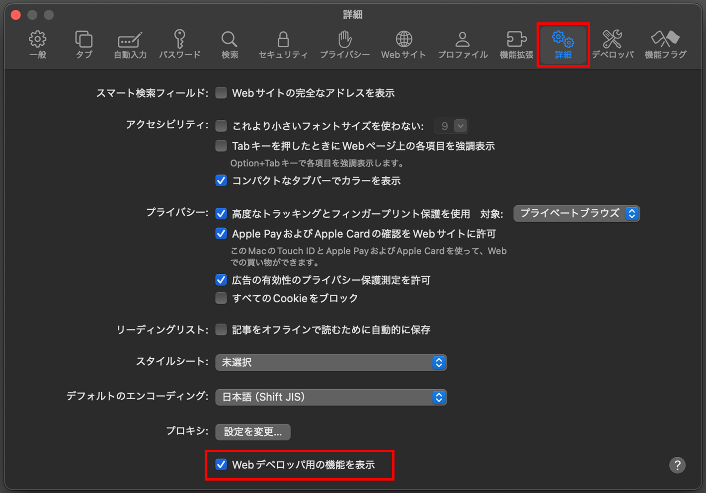 - [詳細]をクリックし、[Webデベロッパ用の機能を表示]のチェックボックスにチェックを付けます。