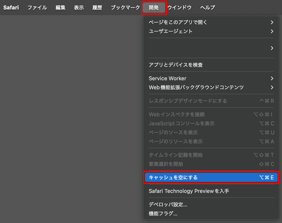 - メニューバーに追加された [開発]から、[キャッシュを空にする] を選択すると、削除が始まります。