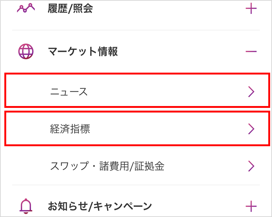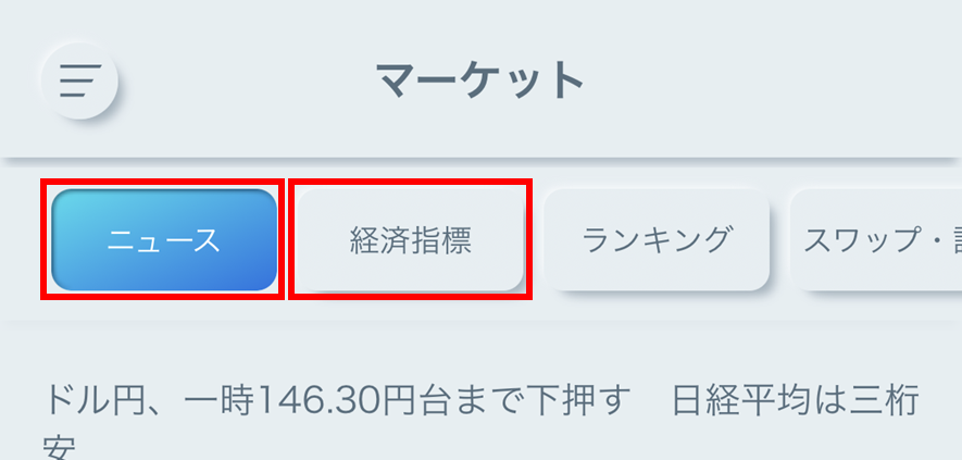 - 画面右上[≡](メニュー)をタップし、[マーケット情報]をタップ