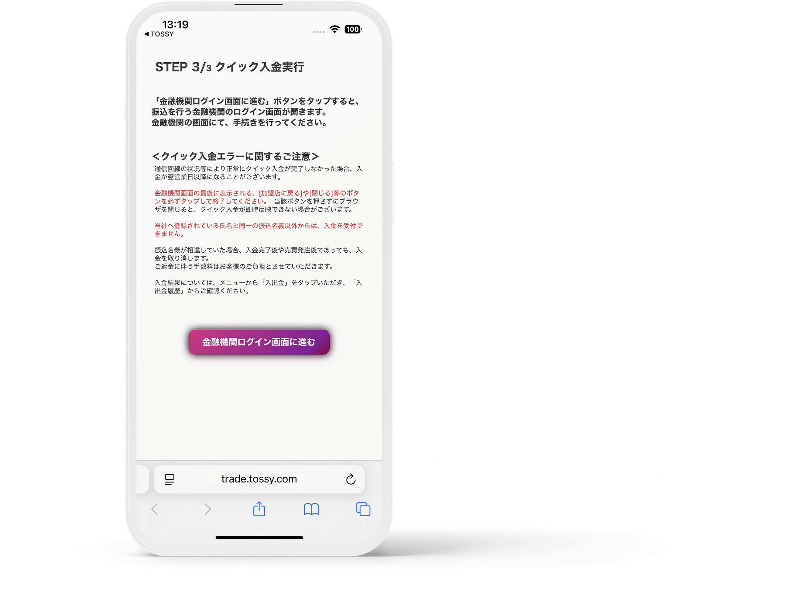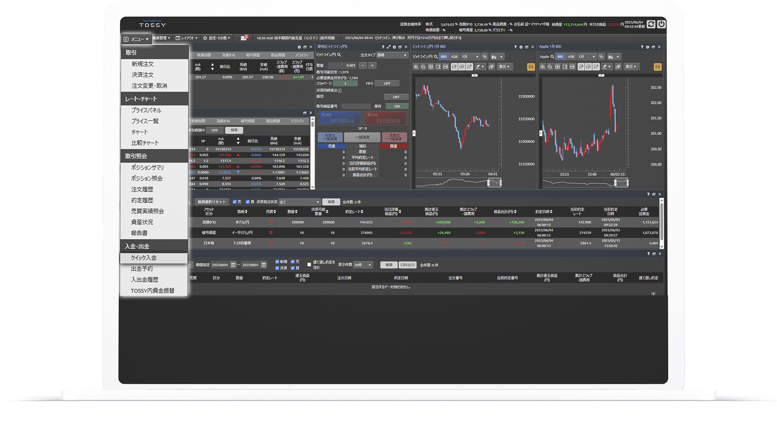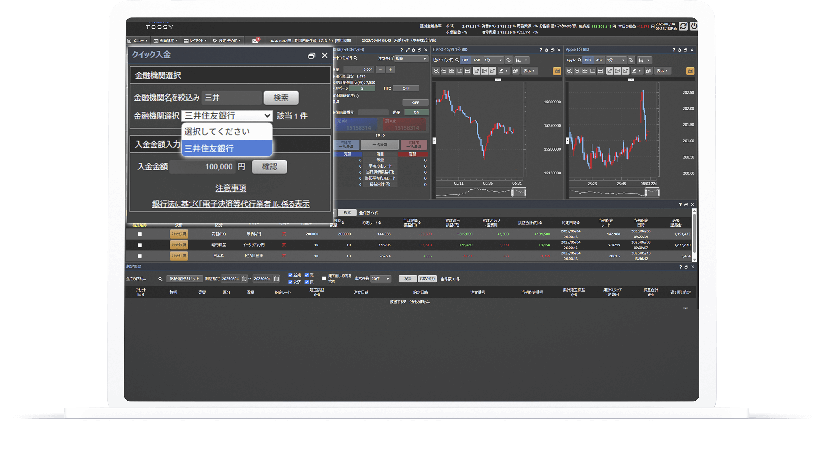 TOSSYで取引するためには、あらかじめTOSSYのアカウントに、入金いただく必要がございます。TOSSYのアカウントへの入金方法は「クイック入金」と「振込入金」の2通りございます。各入金方法の詳細について、以下にご案内いたします。