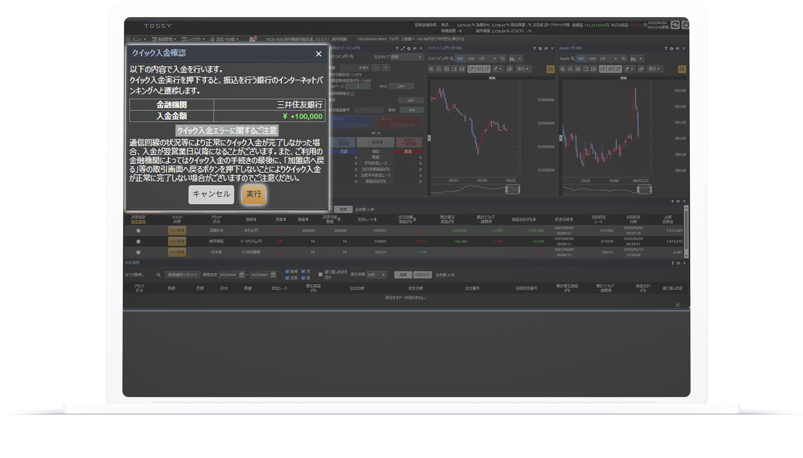 - 証拠金自動振替設定がOFFの状態で入金を行った場合は、株式のアセットに資金反映が行われます。必要に応じて、該当のアセットにお客様ご自身でTOSSY内資金振替を行ってください。