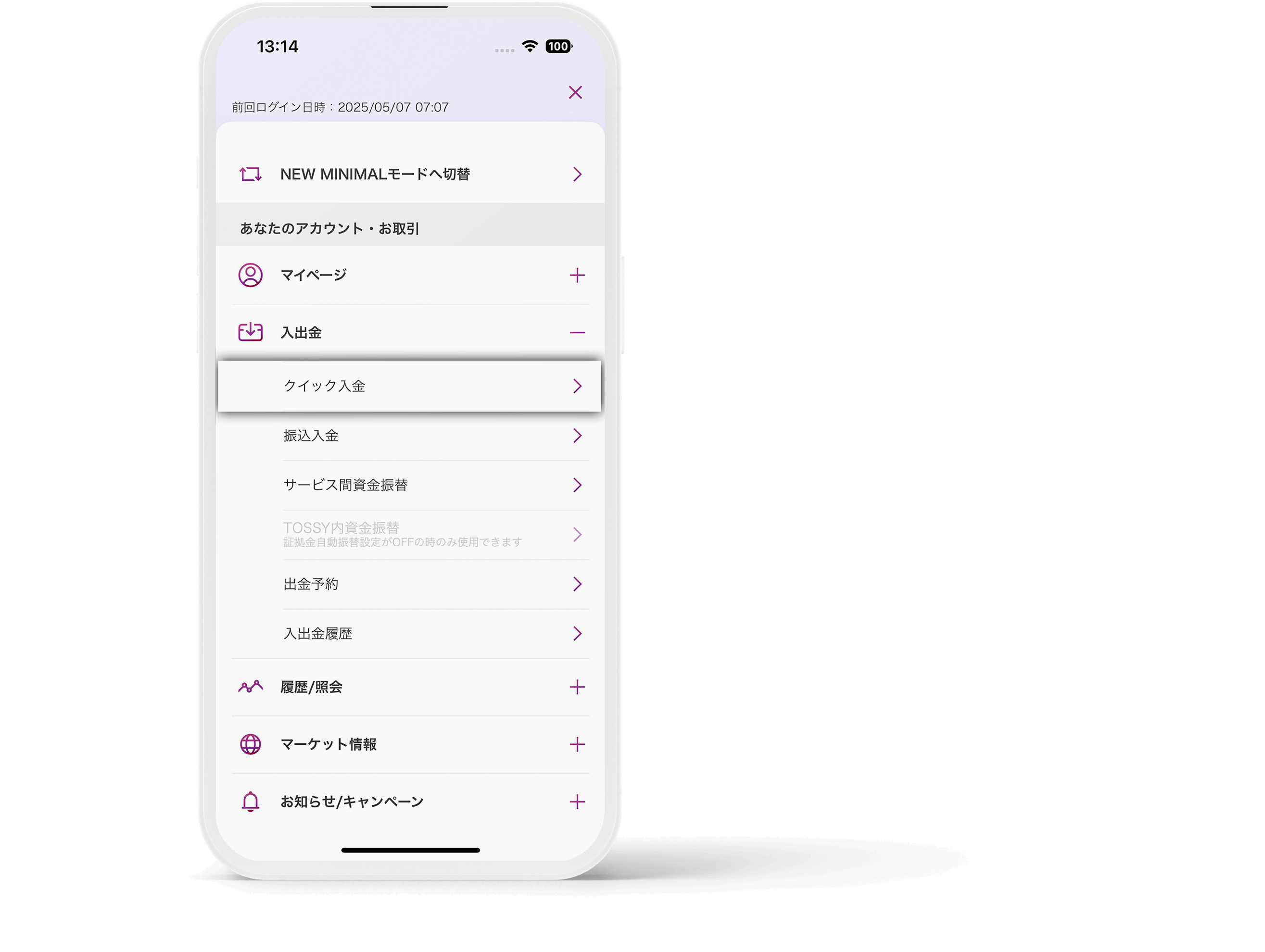 NEW MINIMALモードの場合も、同様の手順でクイック入金を行うことができます。
