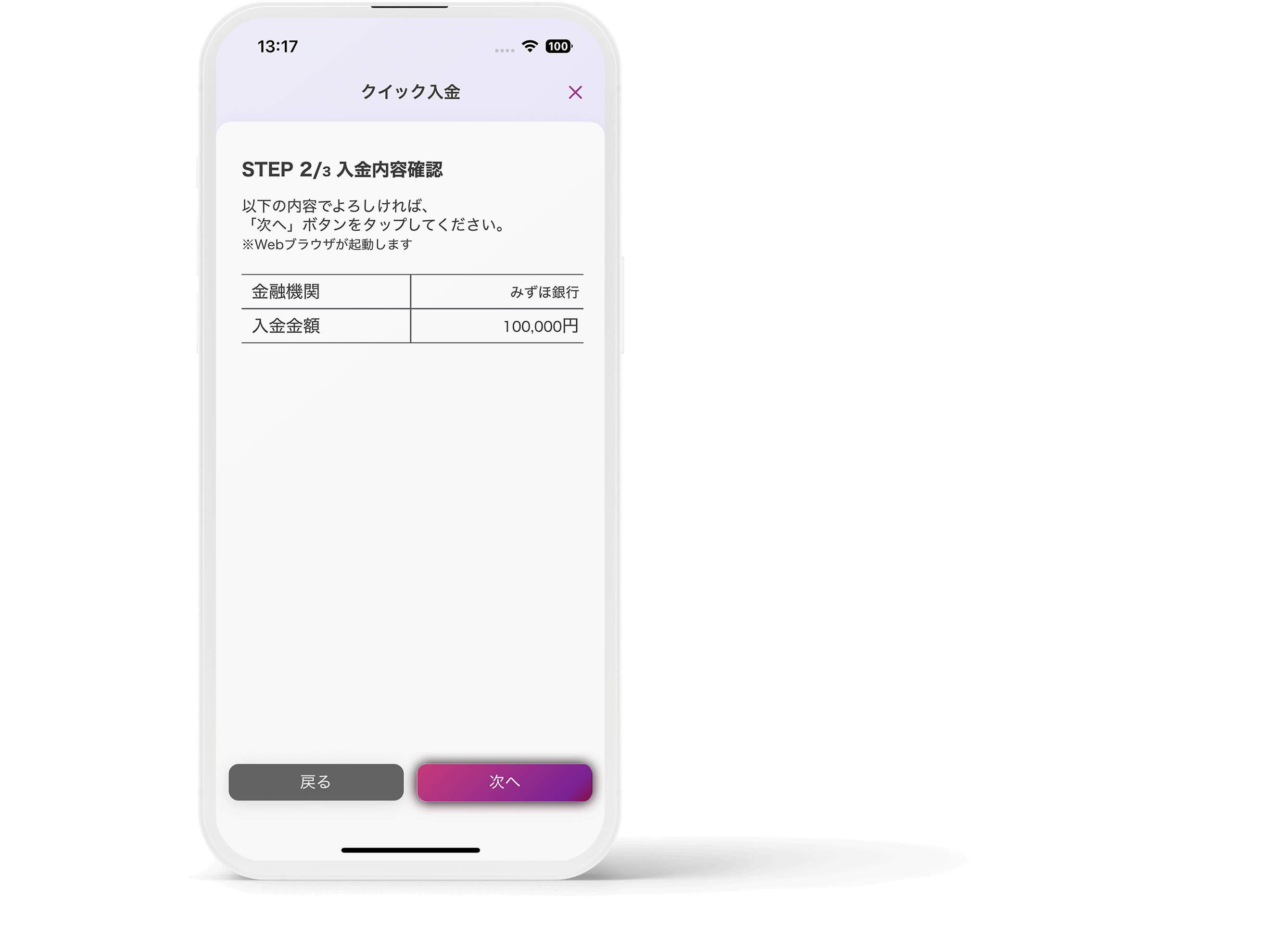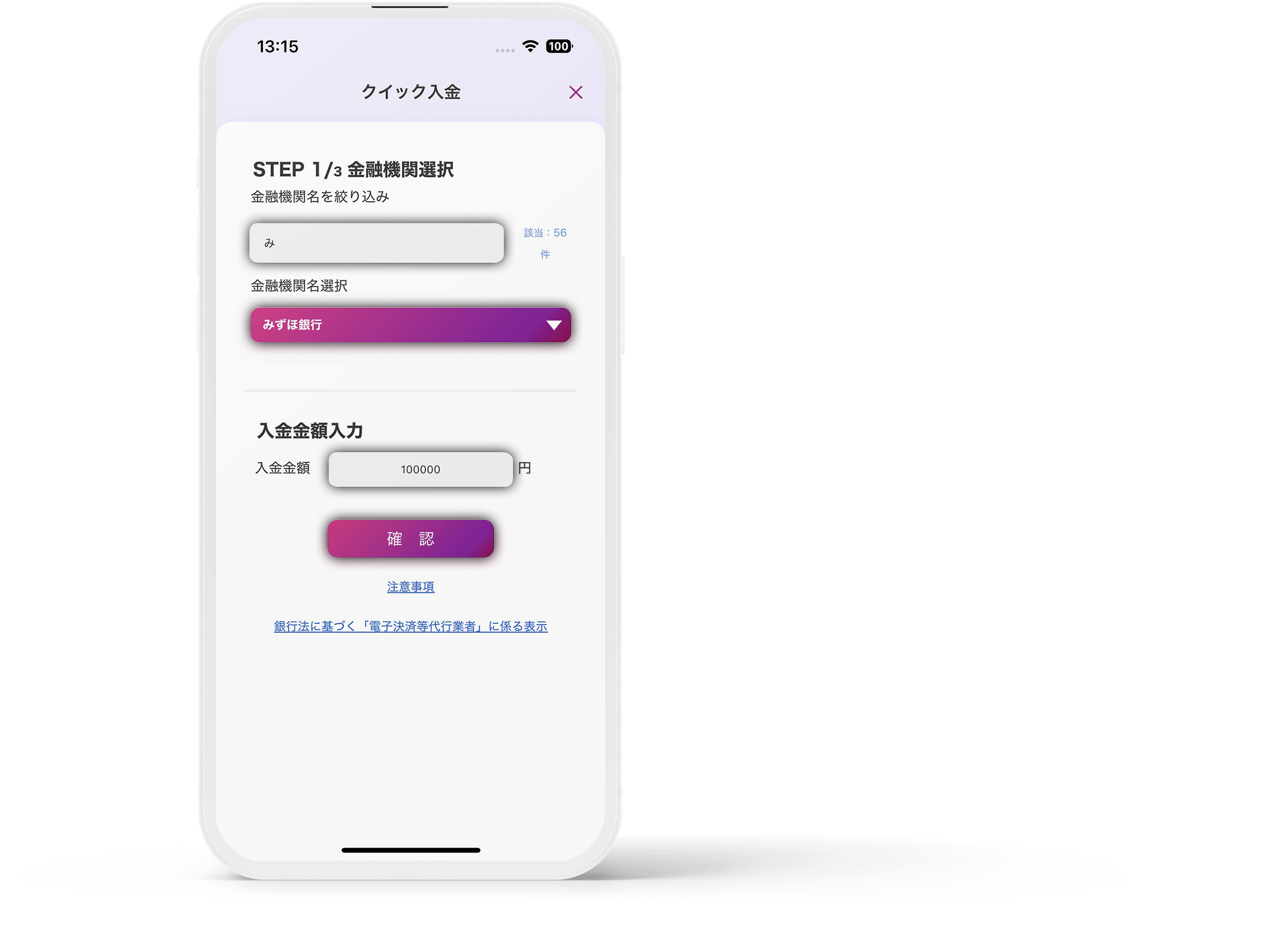 2金融機関の絞り込み検索または、金融機関名を選択>入金金額を入力>[確認]をタップ