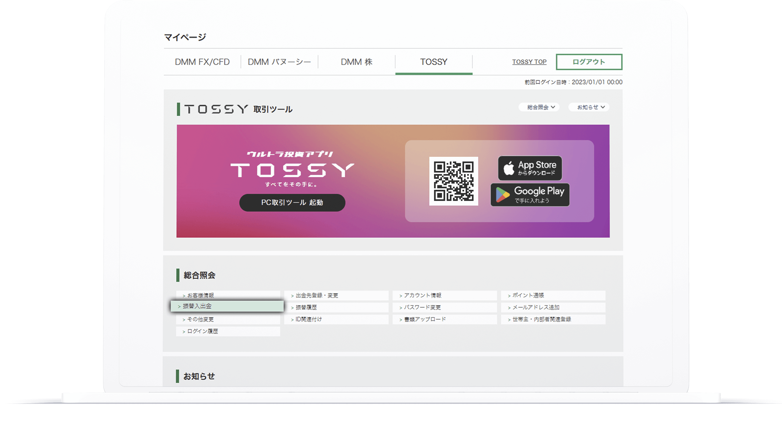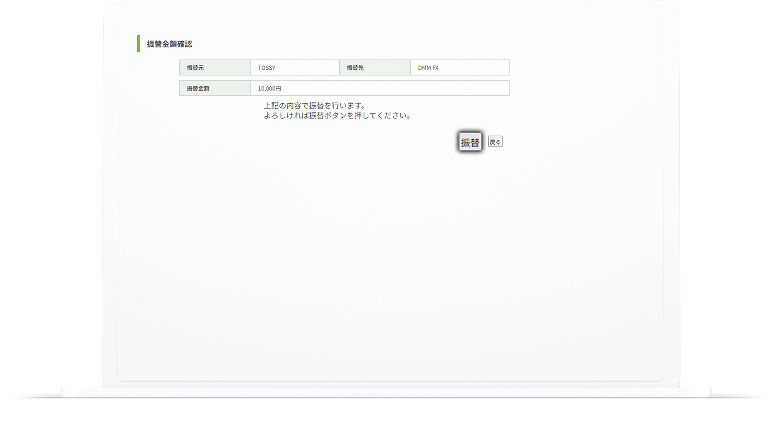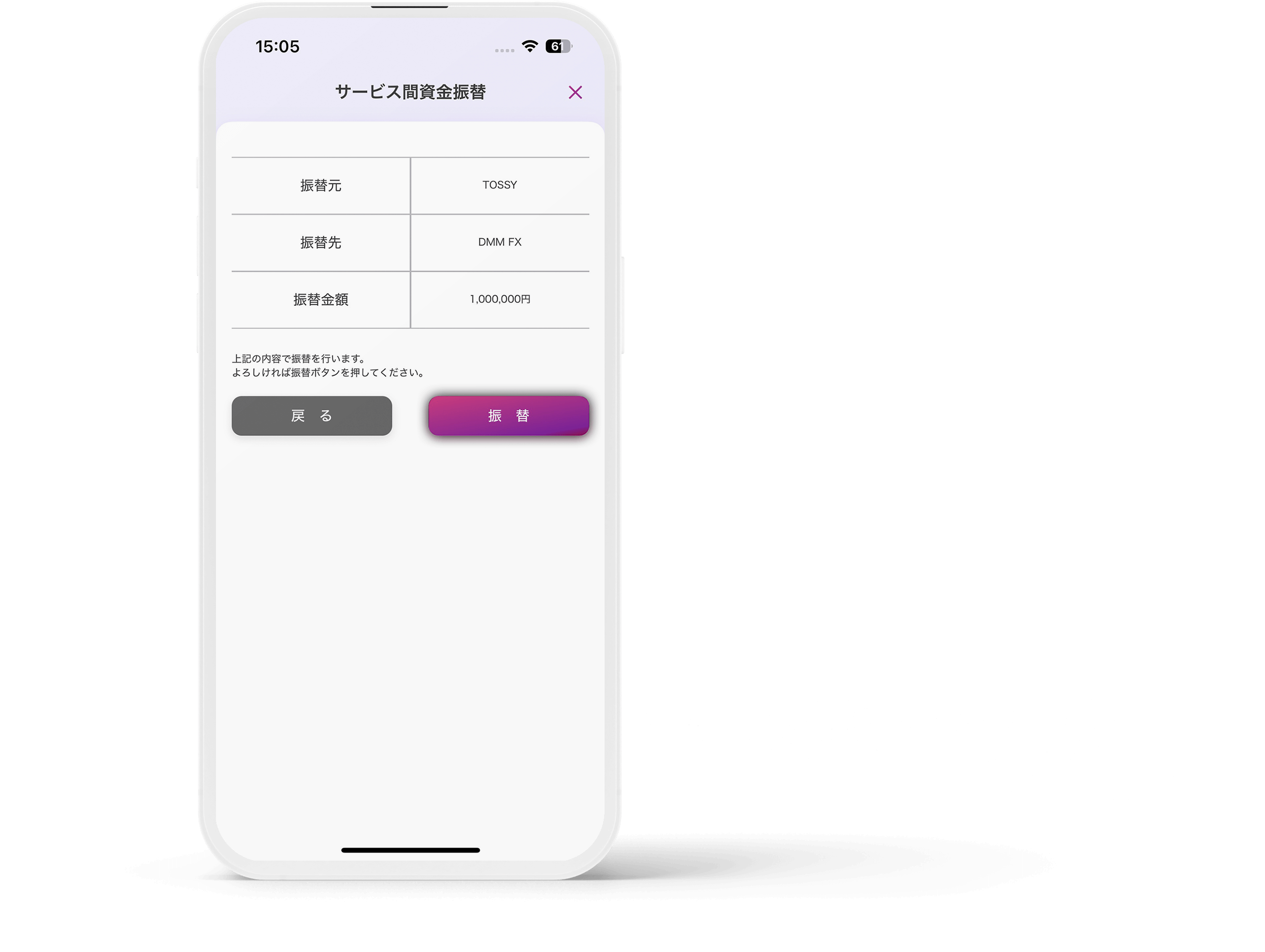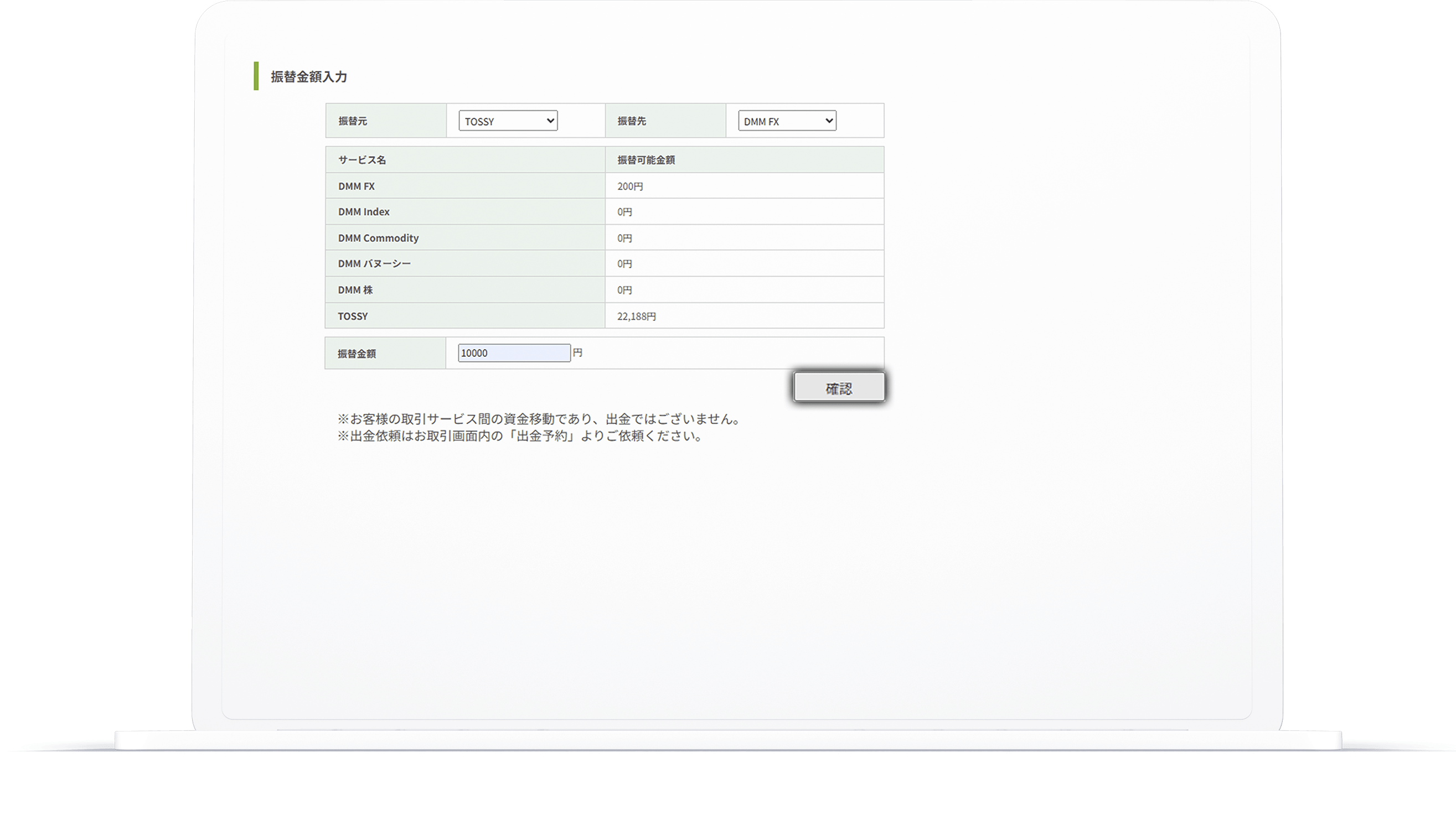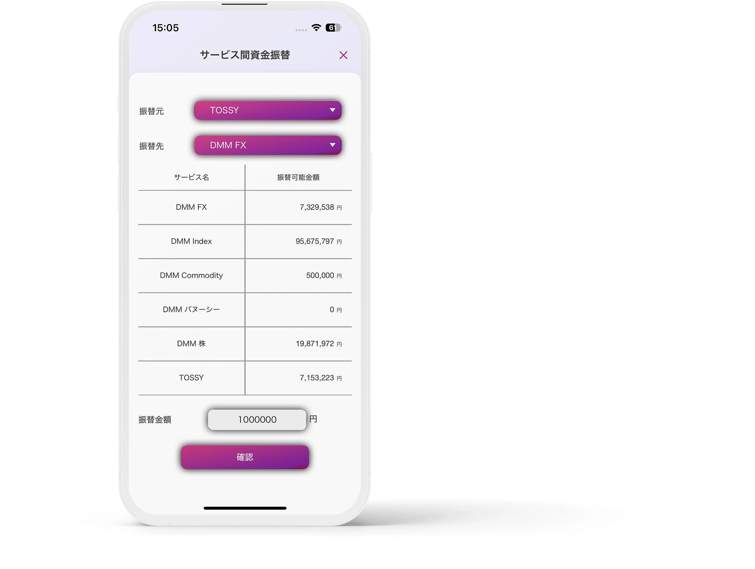 DMM.com証券の各サービスアカウント間(【ウルトラ投資アプリ TOSSY】【DMM FX】【DMM CFD-Index】【DMM CFD-Commodity】【DMMバヌーシー】【DMM株】)で資金移動が可能です。原則24時間リアルタイム反映で振替サービスがご利用いただけます。