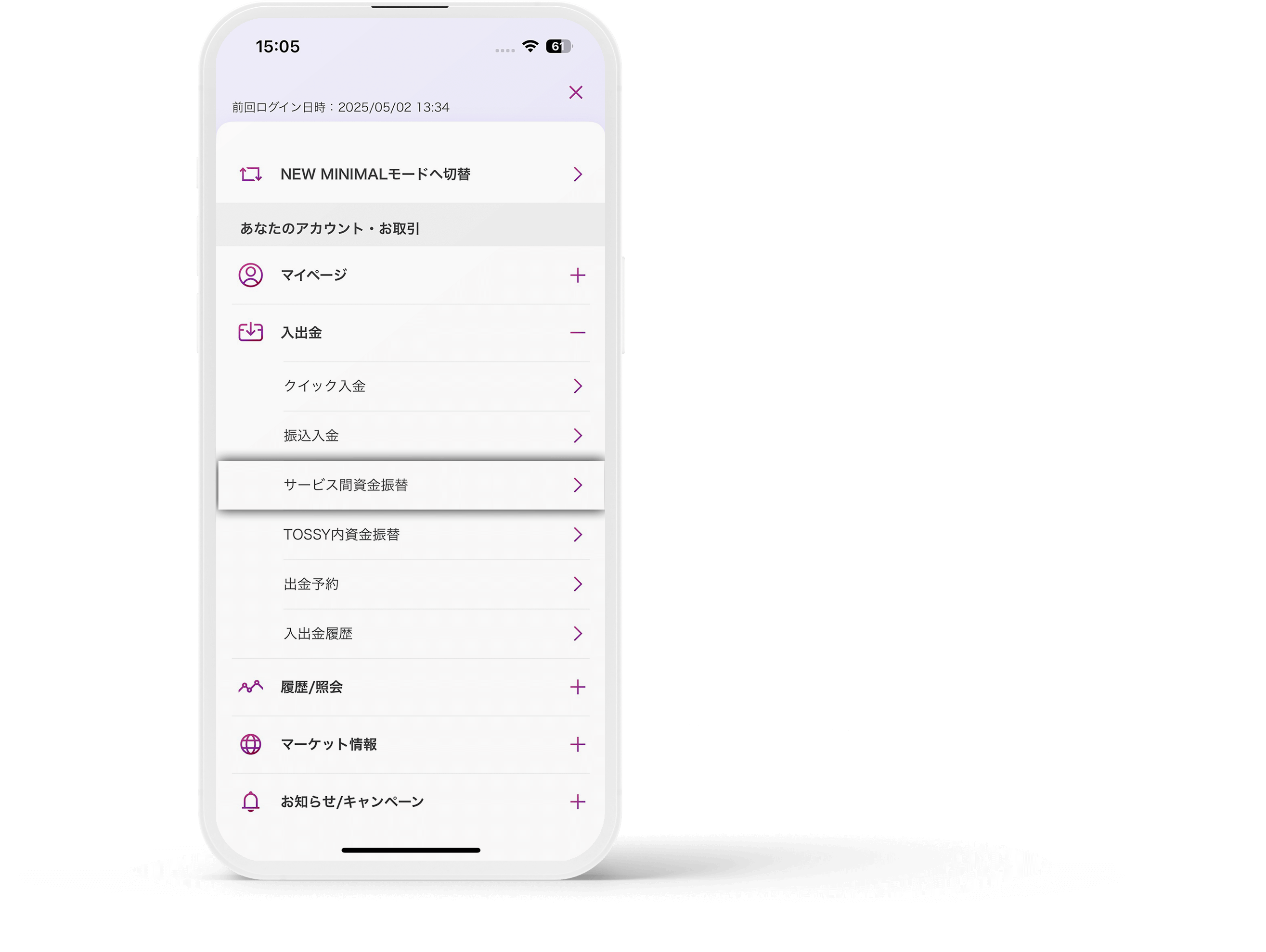 NEW MINIMALモードの場合も、同様の手順でサービス間資金振替を行うことができます。