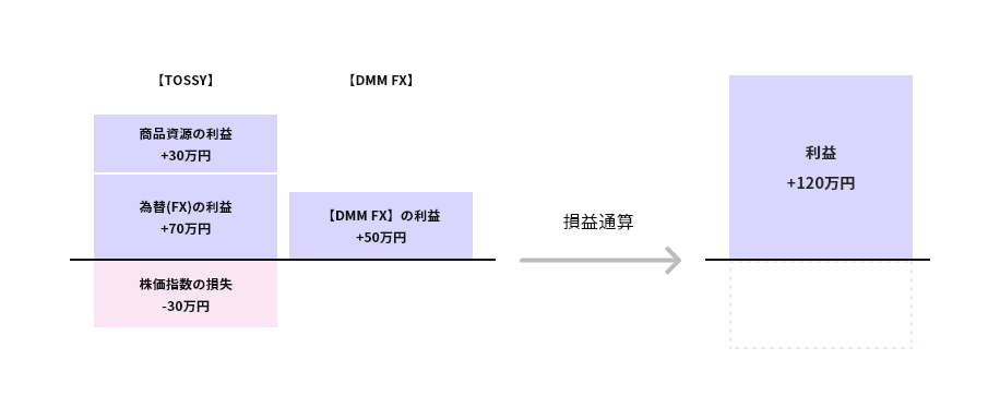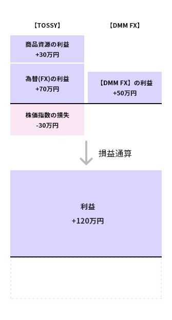 お客様が行ったウルトラ投資アプリ TOSSYのアセット(株式、為替(FX)、商品資源、株価指数、バラエティ)で発生した益金及びスワップポイントは、「雑所得」として申告分離課税の対象となり、DMM.com証券が提供する【DMM FX】【DMM CFD-Index】【DMM CFD-Commodity】や他社のFX取引との損益通算が可能です。