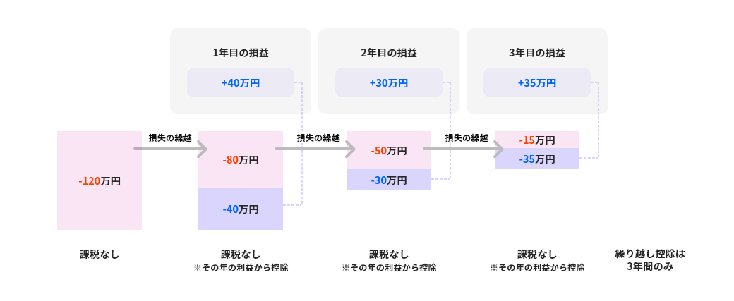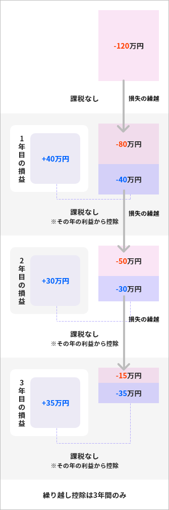 取引で損失となった場合、その翌年以降3年間に渡り店頭FX/CFD及び取引所先物取引等で発生した利益から損失額を控除することが可能です。