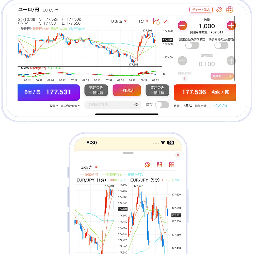 縦画面チャート・横画面チャートにはそれぞれ注文機能も搭載!