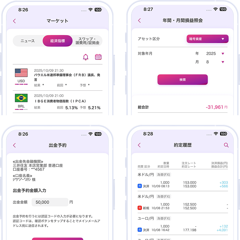 入出金、マーケット情報、取引、履歴照会などお取引に必要な操作がすべてこのアプリで完結します。